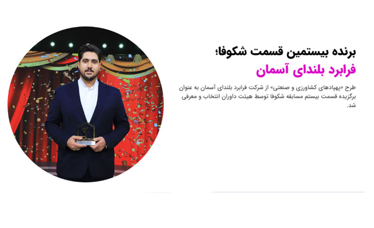 در بیستمین قسمت از مسابقه بزرگ تلویزیونی «شکوفا»، شرکت دانشبنیان «فرابرد بلندای آسمان» با طرح تولید «پهپادهای کشاورزی و صنعتی» با رأی داوران، از میان سه تیم شرکتکننده به عنوان تیم برگزیده انتخاب شد.