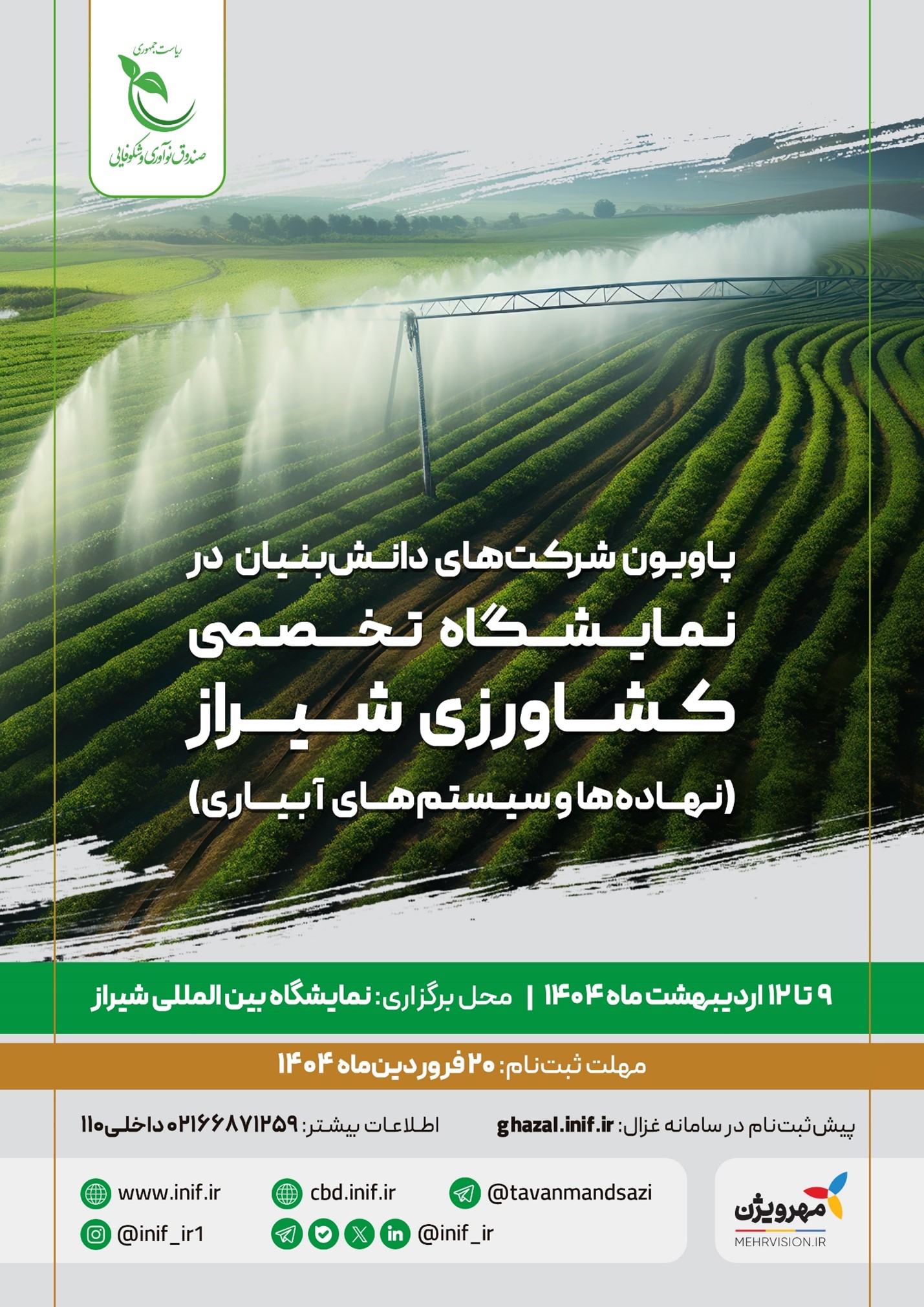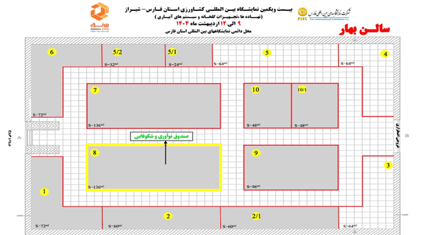 پاویون شرکتهای دانشبنیان در بیستویکمین نمایشگاه تخصصی کشاورزی شیراز (نهادهها و سیستمهای آبیاری) به متراژ 136 متر در سالن بهار برپا میشود.
