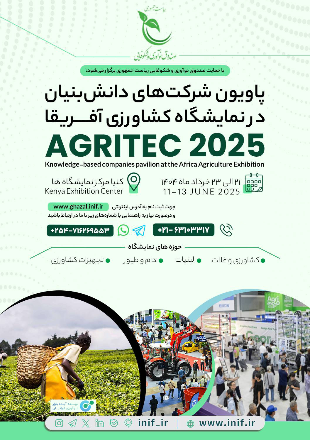سامانه غزال (Ghazal.inif.ir) > توانمندسازی و کمک > توسعه بازار > پاویون شرکت‌های دانش‌بنیان در نمایشگاه کشاورزی کنیا (Agritec Africa 2025)
