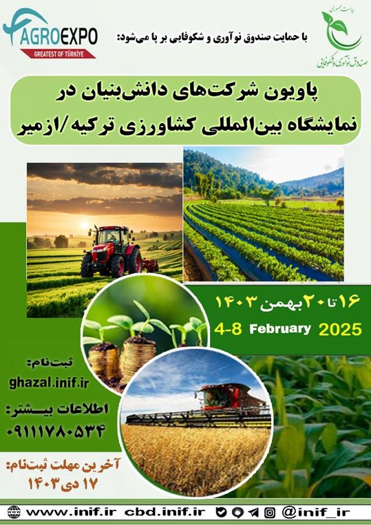 سامانه غزال (Ghazal.inif.ir) > توانمندسازی و کمک > توسعه بازار > پاویون شرکت‌های دانش‌بنیان در بیستمین نمایشگاه صنعت کشاورزی، دام و طیور ترکیه (ازمیر)
