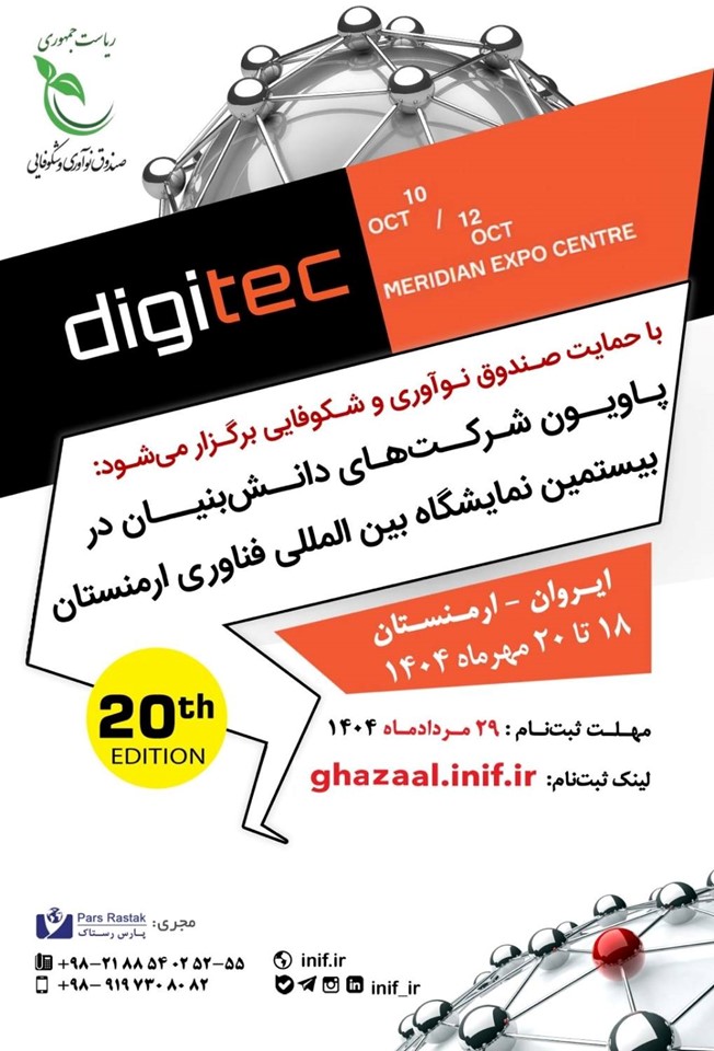 سامانه غزال (Ghazaal.inif.ir) > توانمندسازی و کمک > توسعه بازار > حضور در پاویون نمایشگاه خارجی > پاویون دانشبنیان در نمایشگاه فناوری ارمنستان (DIGITEC 2025)
