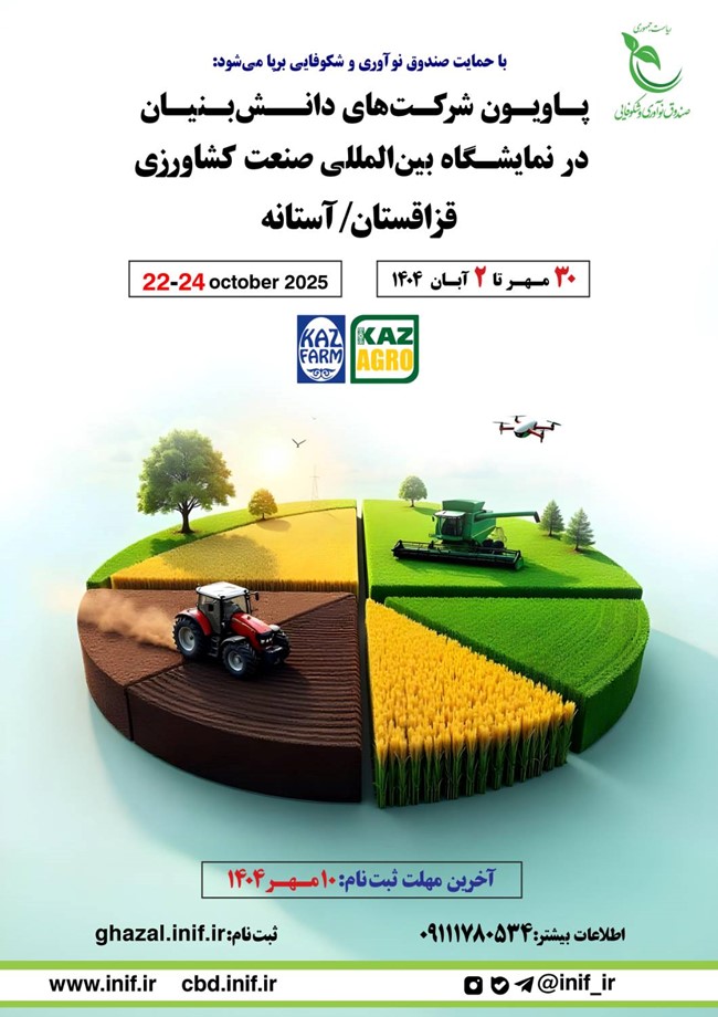 سامانه غزال (Ghazaal.inif.ir) > توانمندسازی و کمک > توسعه بازار > پاویون نمایشگاه خارجی > پاویون دانش‌بنیان در نمایشگاه کشاورزی آستانه (KazAgro/KazFarm 2025)