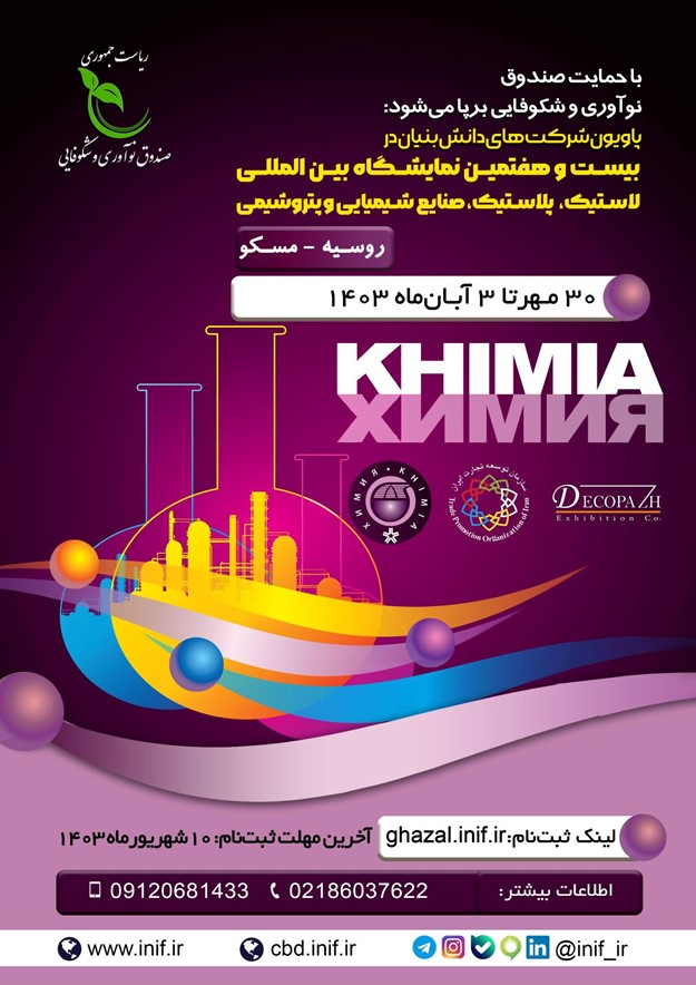 سامانه غزال (Ghazal.inif.ir) > توانمندسازی و کمک > توسعه بازار > پاویون شرکتهای دانشبنیان در نمایشگاه لاستیک، پلاستیک، صنایع شیمیایی و پتروشیمی روسیه (KHIMIA)