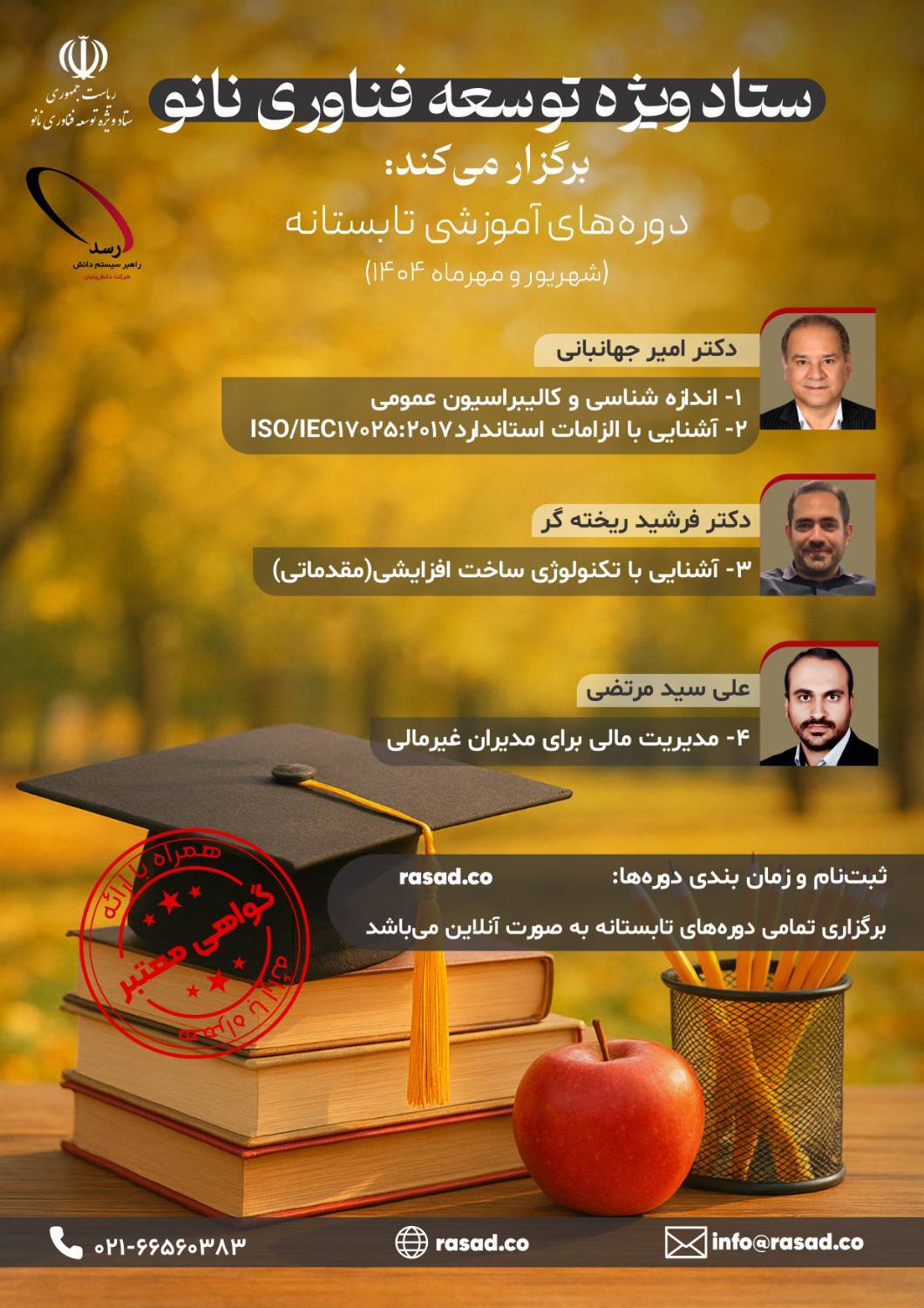 دورهها «اندازهشناسی و کالیبراسیون عمومی» و «آشنایی با الزامات استاندارد ۱۷۰۲۵:۲۰۱۷ ISO/IEC» با تدریس دکتر امیر جهانبانی، دوره «آشنایی با تکنولوژی ساخت افزایشی (مقدماتی)» با تدریس دکتر فرشید ریختهگر و دوره «مدیریت مالی برای مدیران غیرمالی» با تدریس علی سیدمرتضی برگزار خواهند شد.