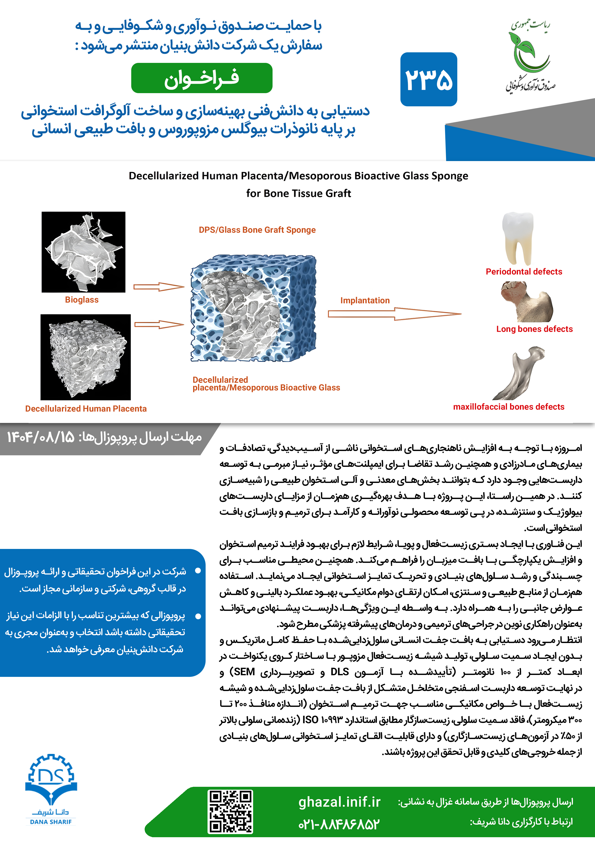 فراخوان مشارکت در طرح «بهینهسازی و ساخت آلوگراف استخوانی بر پایه نانوذرات بیوگلس مزوپوروس»