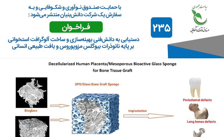دویستوسیوپنجمین فراخوان پژوهشی مشارکت در طرحی با عنوان «دستیابی به دانش فنی بهینهسازی و ساخت آلوگراف استخوانی بر پایه نانوذرات بیوگلس مزوپوروس و بافت طبیعی انسانی» با حمایت صندوق نوآوری و شکوفایی و به سفارش یک شرکت دانشبنیان منتشر شد.