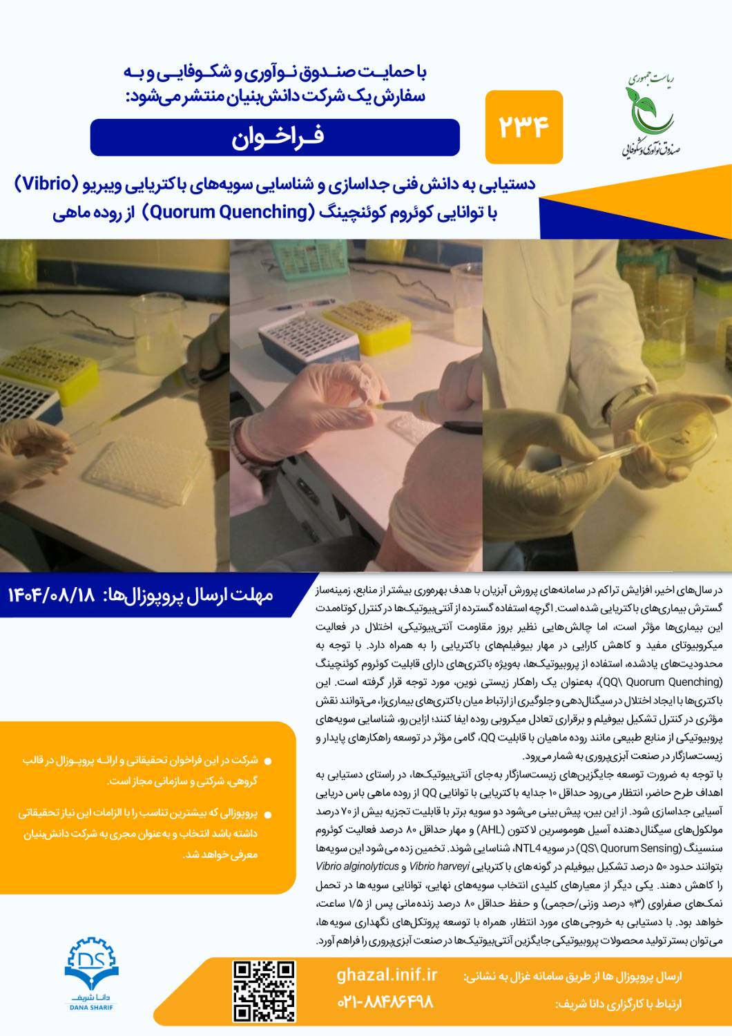 مهلت ثبت‌نام در دویست‌وسی‌وچهارمین فراخوان پژوهشی طرح «دستیابی به دانش فنی جداسازی و شناسایی سویه‌های باکتریایی ویبریو (Vibrio) با توانایی کوئروم کوئنچینگ از روده ماهی» تا روز یکشنبه 18 آبان 1404 تمدید شد.