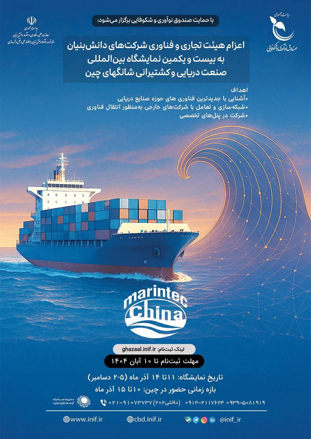 دانشبنیانهای متقاضی حضور در این هیات تجاری و فناوری تا روز شنبه 10 آبان 1404 فرصت دارند در سامانه غزال صندوق نوآوری و شکوفایی به نشانی ghazaal.inif.ir ثبتنام کنند و جهت کسب اطلاعات بیشتر با شماره تلفنهای 09122117624 و 02191073737 داخلی 202 (مدیریت صادرات آینده همگرای تجارت) تماس حاصل نمایند.