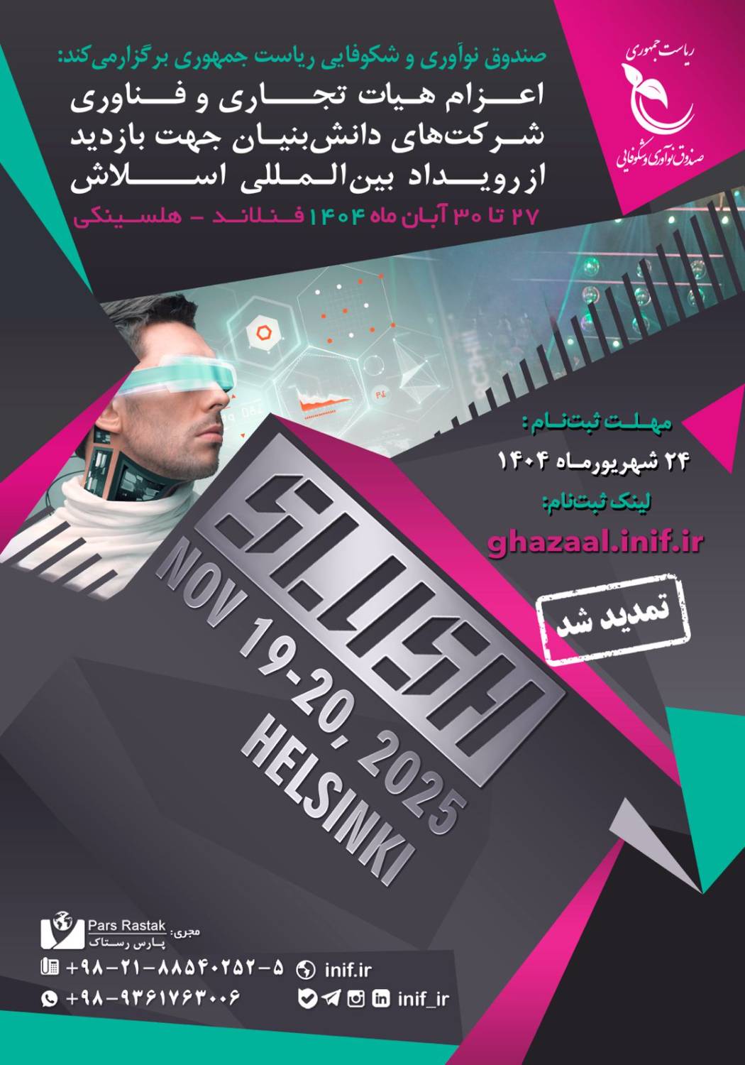 شرکت‌های دانش‌بنیان متقاضی حضور در این هیات تجاری و فناوری تا روز دوشنبه 24 شهریور ماه 1404 فرصت دارند در سامانه غزال صندوق نوآوری و شکوفایی به نشانی ghazaal.inif.ir ثبت‌نام کنند و جهت کسب اطلاعات بیشتر با شماره تلفن‌های 5 -02188540252 و 09361763006 (کارگزاری پارس رستاک) تماس حاصل نمایند.