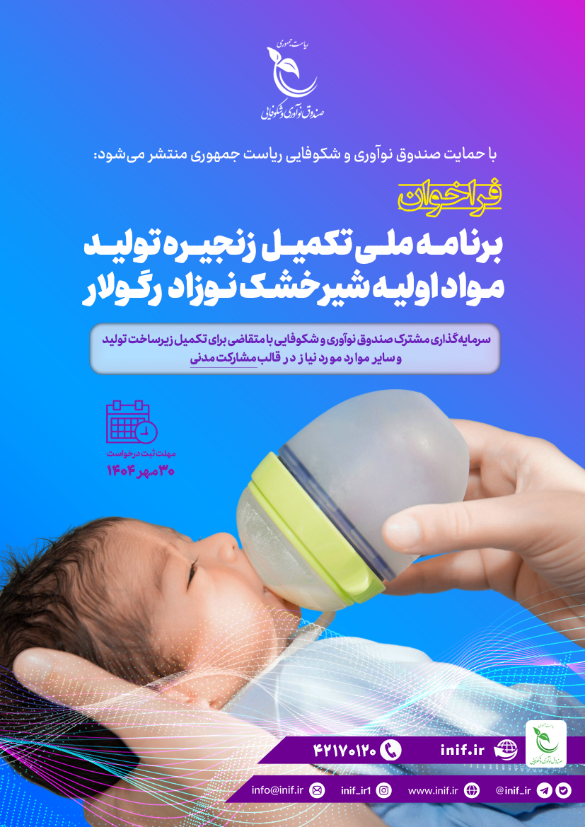 فراخوان مشارکت در برنامه ملی «تکمیل زنجیره تولید مواد اولیه شیرخشک نوزاد رگولار» از سوی صندوق نوآوری منتشر شد